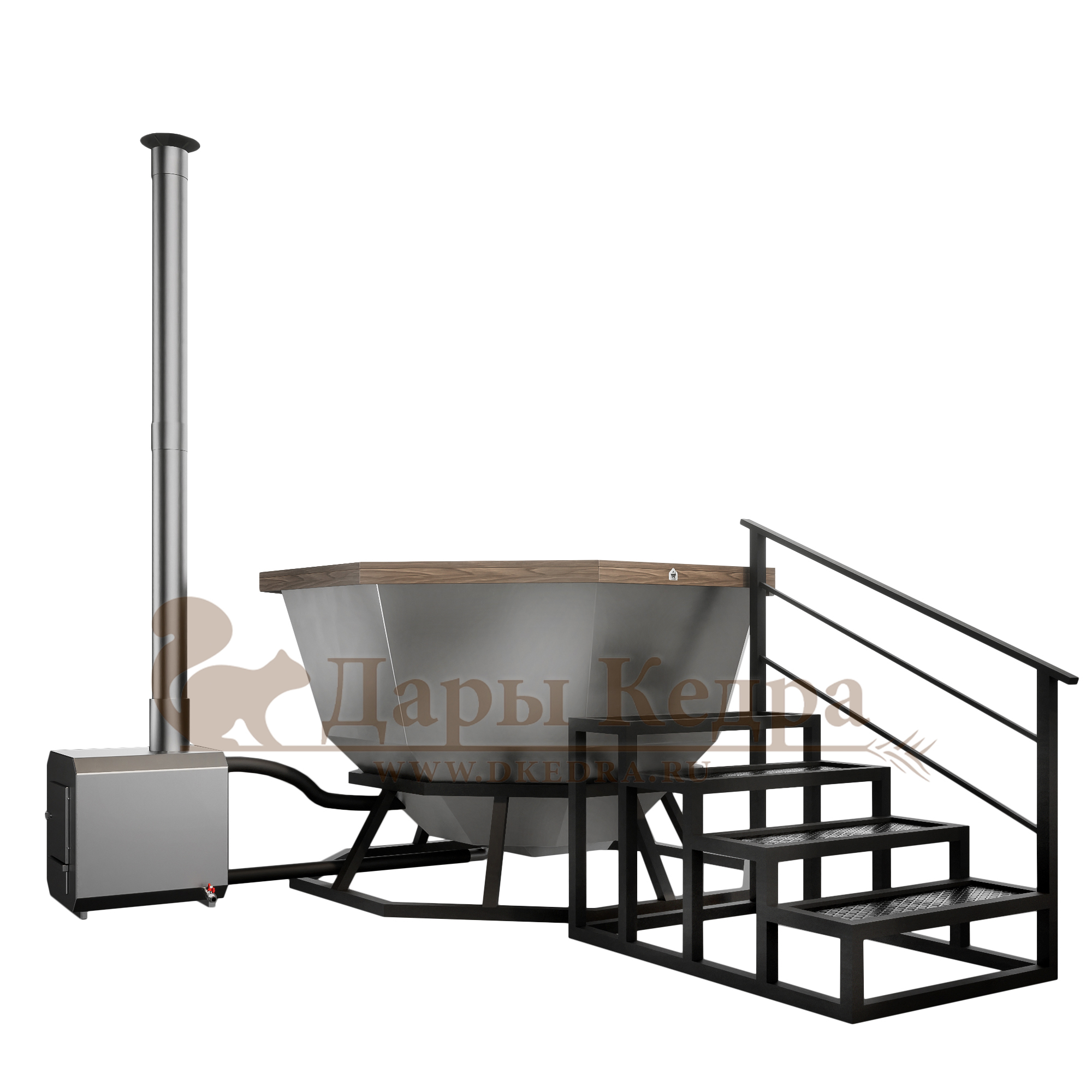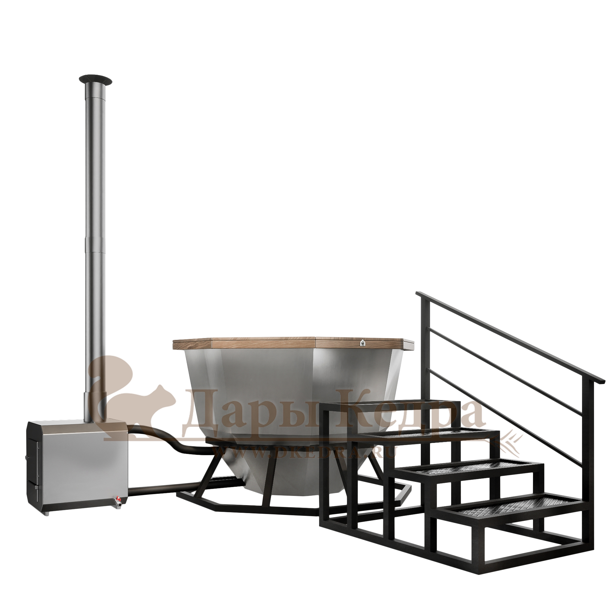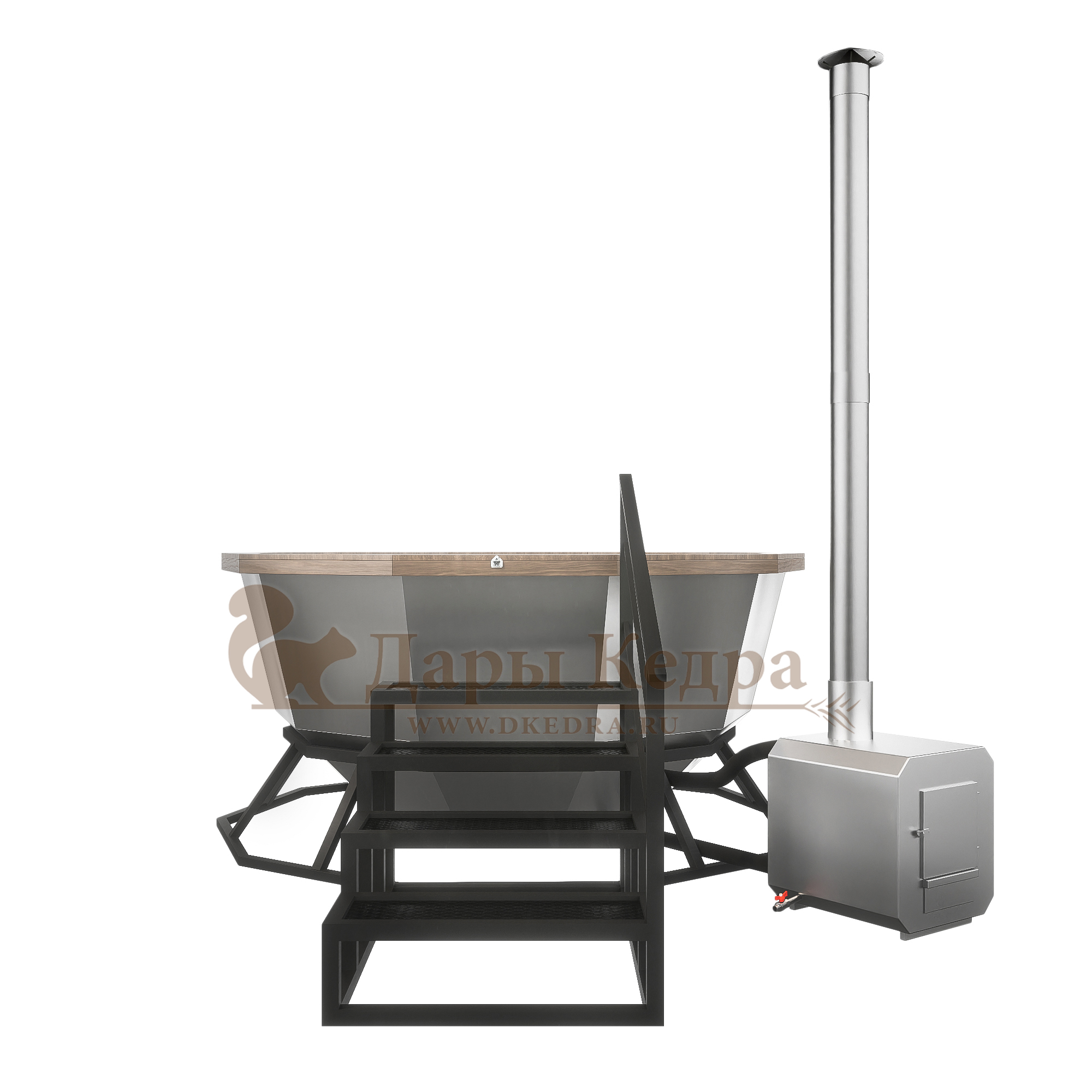 • Банный чан из нержавеющей стали Ø-1750 на подставке с приставной печью Банный чан с приставной печкой изготовлен из пищевой стали. Представляет собой большую ёмкость в виде чаши, при нагревании которой можно париться на свежем воздухе. Чан установлен на устойчивую металлическую подставку и оснащен приставной печью с дымоходом. Банный чан оборудован кедровым бортом, скамейками, подспинниками, трапом для ног и приставной лестницей.