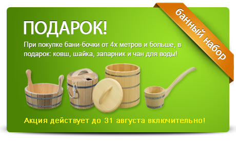 Купив у нас баню-бочку вам уже не нужно думать о тазиках и ковшиках, мы подготовили всё необходимое, чтобы вы могли в первый же день установки воспользоваться своей банькой! До 31 августа, при покупке бани-бочки от 4х метров и больше, в подарок: ковш, шайка, запарник и чан для воды!